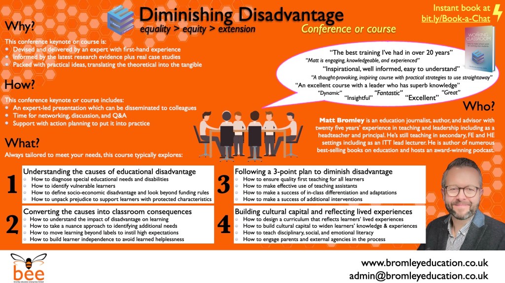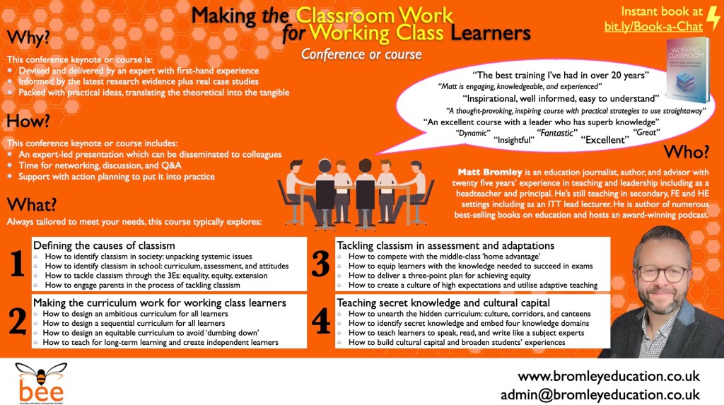 Matt can deliver bespoke training in your school or college on the content of The Working Classroom. All the following can be delivered as conference keynotes or as half-day or full-day training courses. They can also be combined to create a package of training. All are flexible and can be made bespoke to suit your setting.